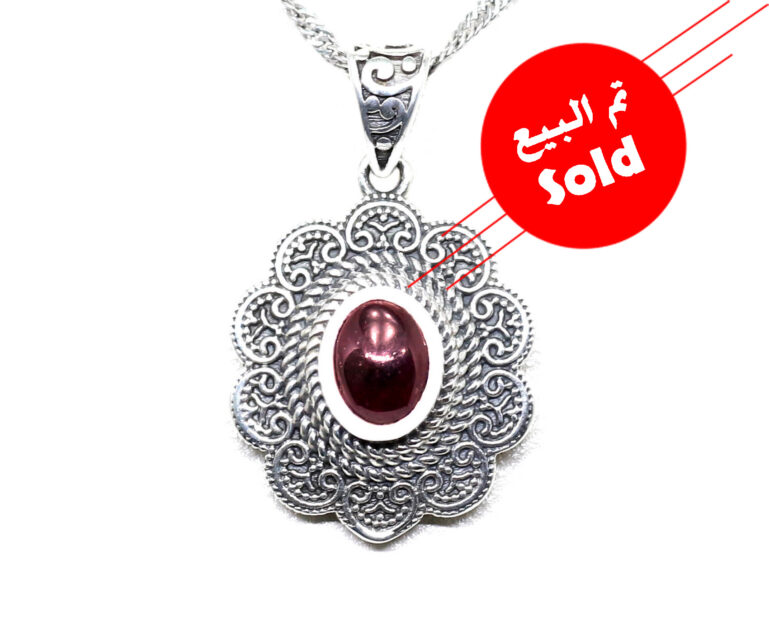 دلاية تحفة من الفضة عيار 925 صياغة Hand Made متوجة بجوهرة من حجر الجارنيت الأحمر الطبيعي تحفة – ياقوت الجارنيت Garnet Stone – مرفق مع الدلاية شهادة مختومة بختم موقعنا الرسمي