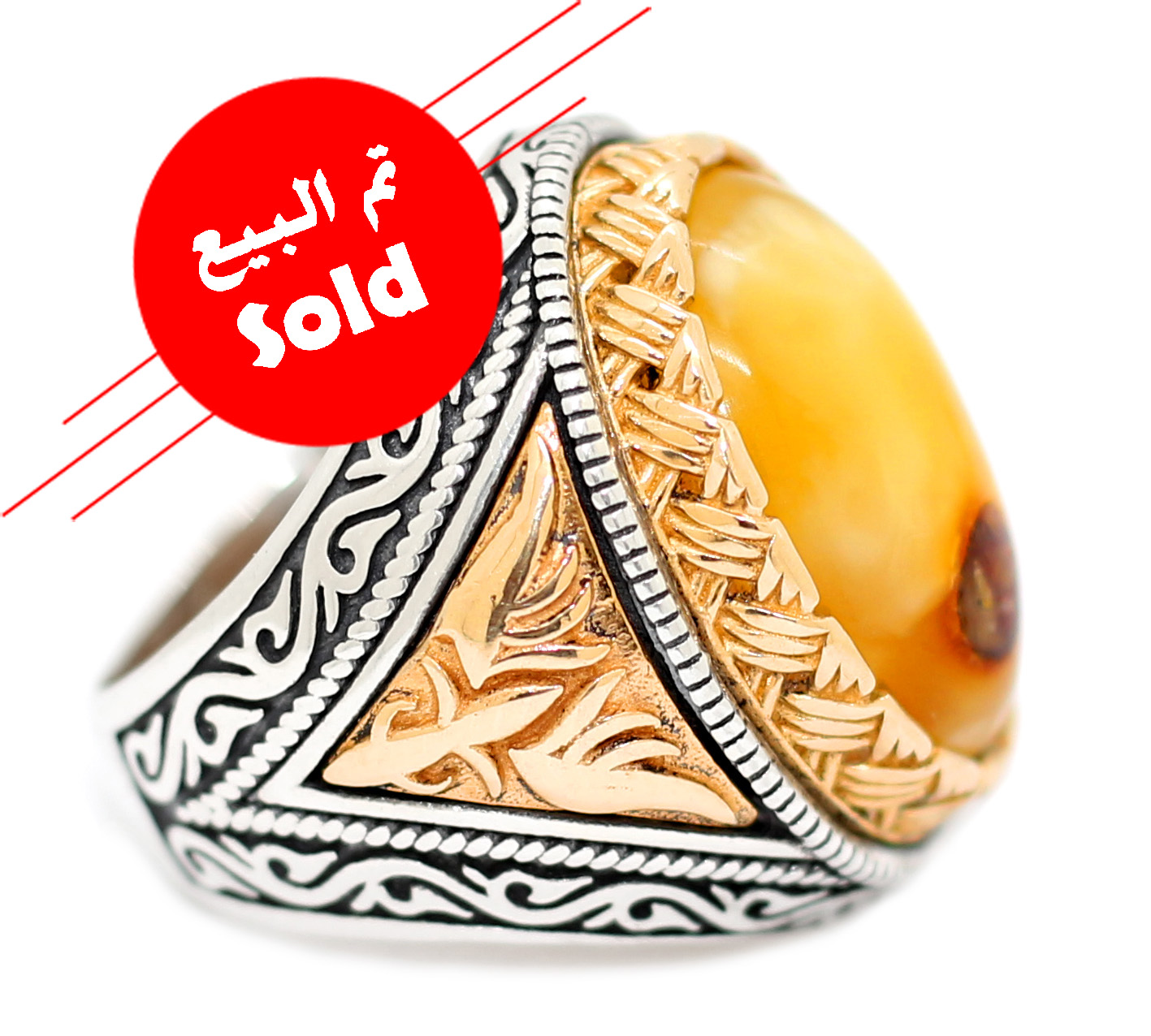 خاتم ملكي تحفة من الفضة عيار 925 مطعم بالنحاس الذهبي – لأصحاب الذوق الرفيع – ومرصع بـ فصوص الزركون الاحمر ومتوج بفص تحفة ونادر من العقيق الشجري الطبيعي Agate المصور منظر حوت – مرفق مع الخاتم شهادة مختومة ومعتمدة من مركزنا