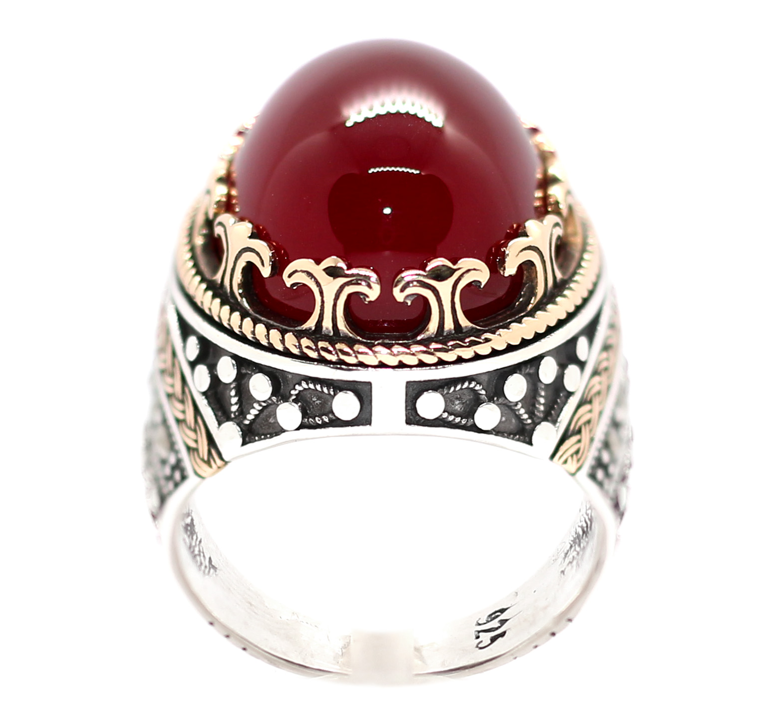 خاتم ملكي من الفضة عيار 925 مطعم بالنحاس الذهبي ومرصع بفصوص الماركزيت – لأصحاب الذوق الرفيع – ومتوج بفص تحفة من حجر الفيروز الطبيعي المعرق Turquoise – مرفق مع الخاتم شهادة معتمدة ومختومة من مركزنا
