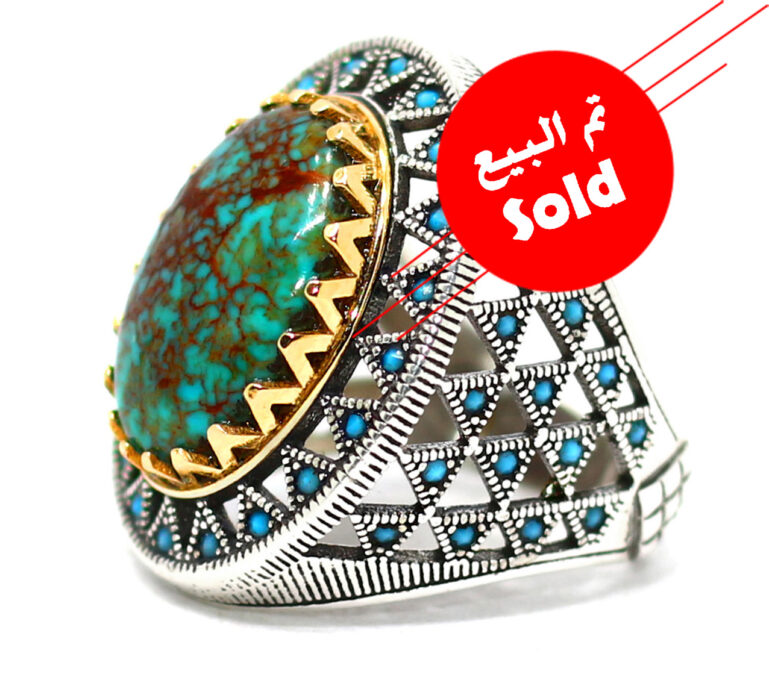خاتم ملكي من الفضة عيار 925 مطعم بإطار من ذهبي عالي البريق ومرصع فصوص الزركون ومتوج بحجر مميز جدا من الفيروز السيناوي الطبيعي المعرق القديم Turquoise الحُر المميز جدا