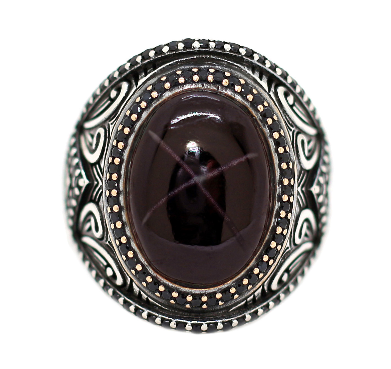 خاتم تحفة من الفضة عيار 925 مطعم بالنحاس الذهبي ومتوج بفص حجر عقيق يمنى طبيعي مصور بألوانه الطبيعية – مرفق مع الخاتم شهادة مختومة ومعتمدة من مركزنا