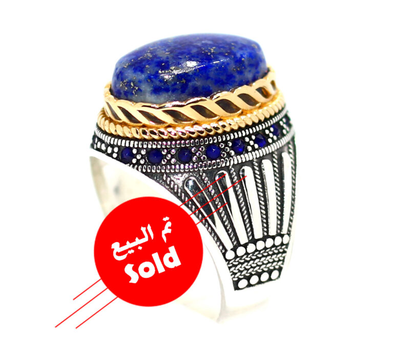 خاتم ملكي تحفة من الفضة عيار 925 مطعم بإطار من النحاس الذهبي – لأصحاب الذوق الرفيع ومرصع بـ فصوص الزركون الأزرق ومتوج بحجر تحفة من اللازَوَرْد Lapis lazuli الطبيعي المميز جدا – حجر الحاسة السادسة (حجر روحاني عالي الروحانية) – مرفق مع الخاتم شهادة مختومة بختم موقعنا الرسمي